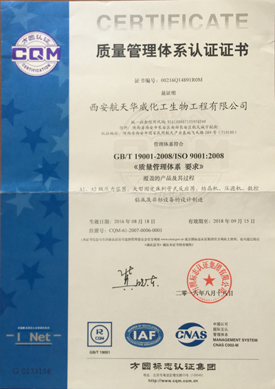 西安航天華威化工生物工程有限公司擁有全面壓力容器及非標(biāo)準(zhǔn)設(shè)備設(shè)計(jì)、制造的各項(xiàng)認(rèn)證資格,確保向客戶提供符合各項(xiàng)標(biāo)準(zhǔn)的產(chǎn)品。