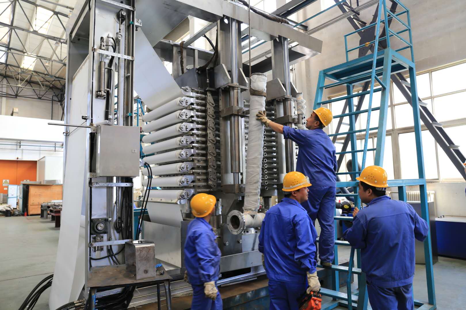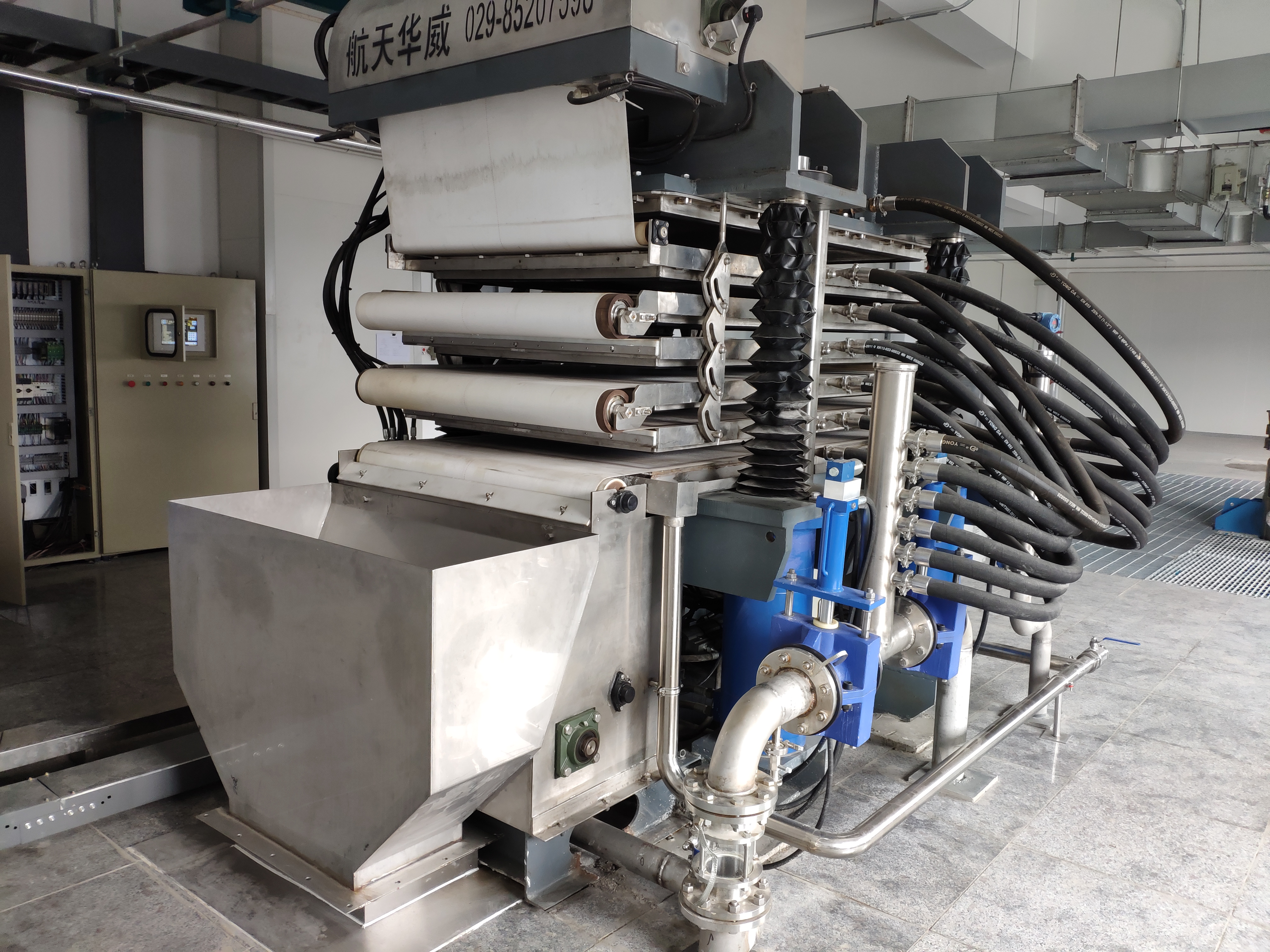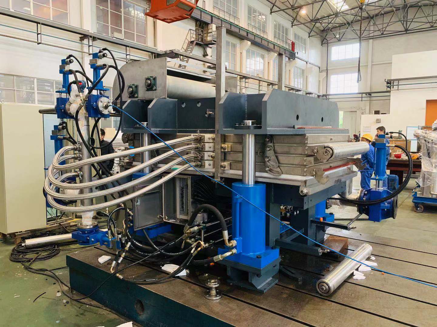 We developed LZB series vertical full automatic plate-frame press filter in 2006. Through pressurizing, the slurry material goes through the filtration medium, then the solid and liquid are separated in an efficient way. This Press filter features automatic rectifying, filtration cloth automatic washing, user-friendly interface etc, and can achieve automatic control and real time monitoring. It runs fully automatically, eco-friendly with lower power consumption and high yield.